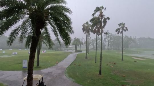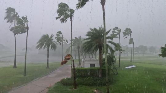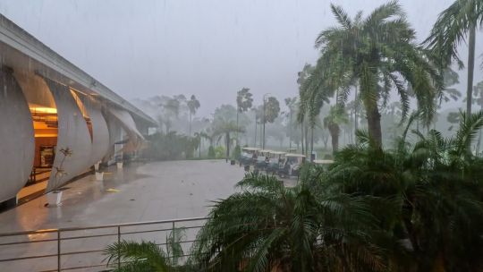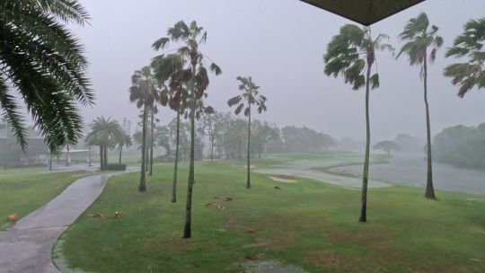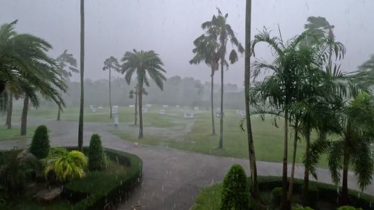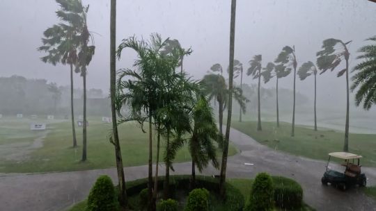 Dramatic weather footage featuring lightning, heavy rain, and dark skies.