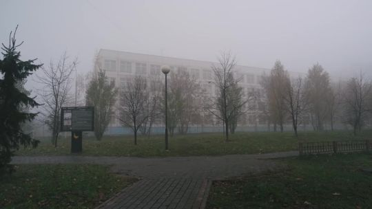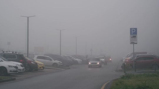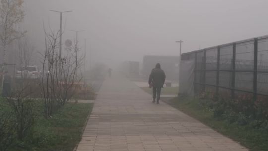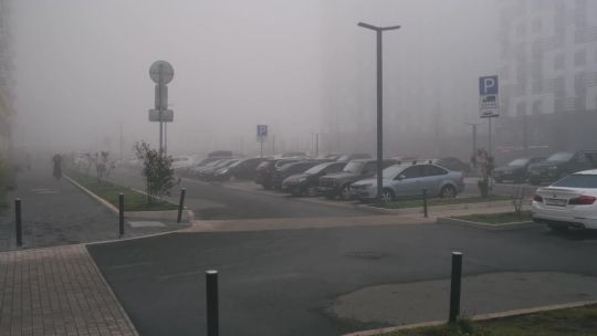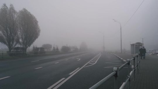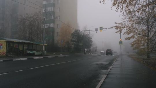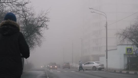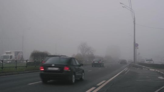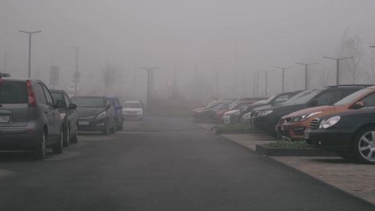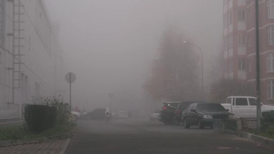 Buy 4K and 5K videos of dense fog in the city. Cars and pedestrians move carefully in low visibility conditions.