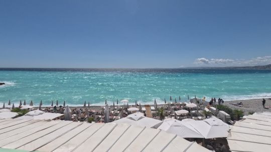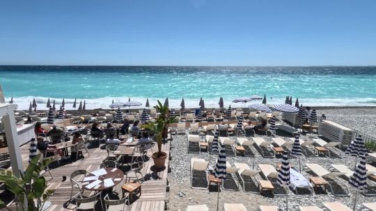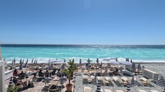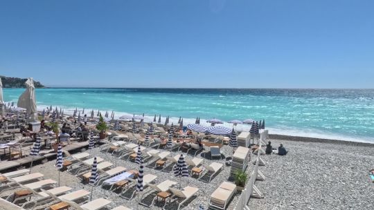 The Promenade des Anglais, the blue chairs, and the turquoise waters of the French Riviera in Nice.