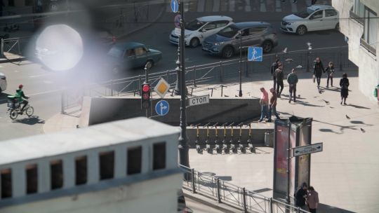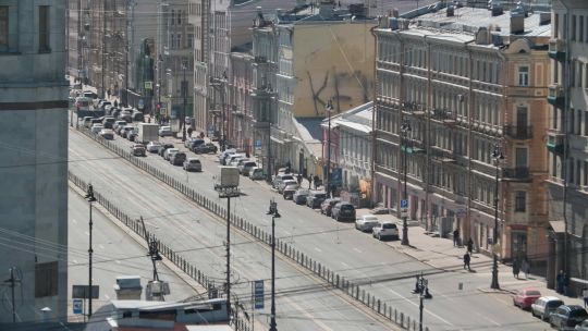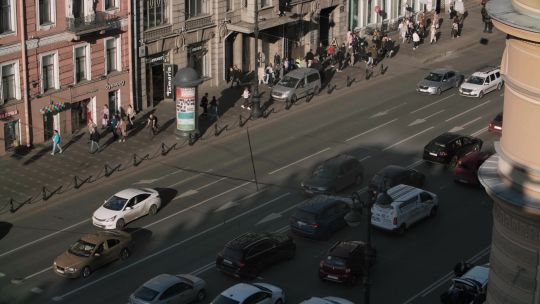 Buy 4K and 5K videos of the city in sunny weather. Bright skies, pedestrians, and vibrant city life.